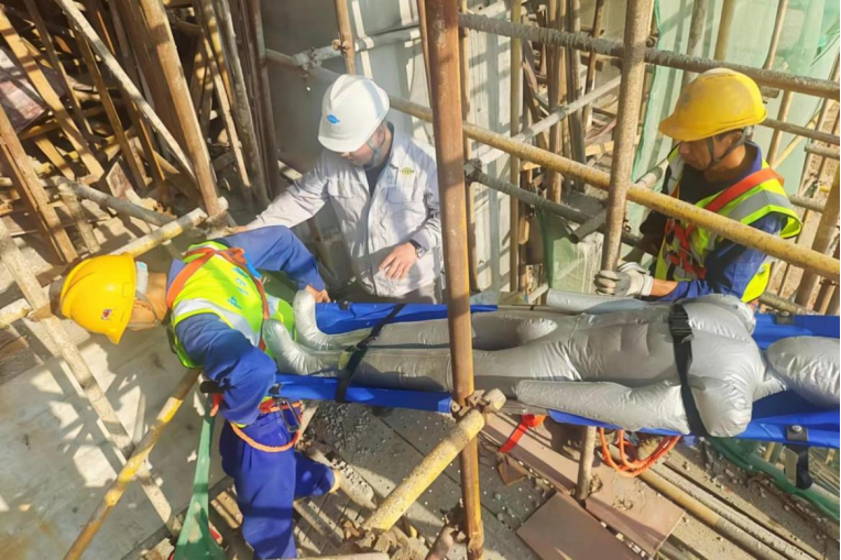 演練過程中,參演人員劃分為收集組、保障組、警戒組、聯(lián)絡(luò)組、搶救組,通過模擬突發(fā)“高處墜落”事故,項(xiàng)目部迅速啟動(dòng)應(yīng)急救援預(yù)案,快速、高效、有序?qū)嵤┚仍ぷ鳎畲蟪潭冉档褪鹿蕮p失,有效減少人員傷亡和財(cái)產(chǎn)損失,維護(hù)施工人員生命安全。