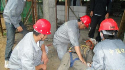 8:30 應(yīng)急救援小組趕到事故現(xiàn)場,現(xiàn)場管理人員說明事故情況及已采取措施。救護(hù)人員汪岳榮首先通報(bào)自己是紅十字救護(hù)員,求助現(xiàn)場人員,模擬人員王成彬(助手),120救護(hù)車引導(dǎo)員(陳學(xué)飛)前往大門口接應(yīng)120救護(hù)車。隨后,呼叫、安撫、檢查傷員情況,發(fā)現(xiàn)傷員左大腿骨折,右手臂受傷,其他地方無大礙。救護(hù)人員對傷者采取臨時(shí)救護(hù),用夾板及繃帶對傷腿進(jìn)行綁扎固定,并抬上擔(dān)架等待救護(hù)車。