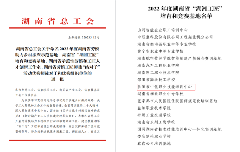 公司岳陽(yáng)市中化職業(yè)技能培訓(xùn)中心獲湖南省“湖湘工匠”培育和競(jìng)賽基地授牌