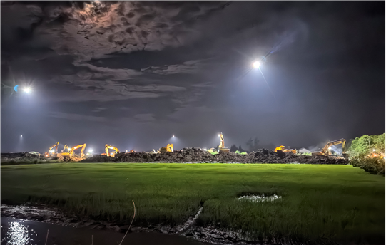 因第三道防線地處岳陽市君山區(qū)良心堡鎮(zhèn)一個小村落,基礎(chǔ)設(shè)施極不完善,施工面臨村內(nèi)稻田、水塘、溝渠縱橫,高壓線、照明線架設(shè)高度不夠,搶建期間社會車輛、搶險車輛密集通行,土方石方須遠(yuǎn)距離運輸?shù)痊F(xiàn)實困難,公司不等不靠,多方協(xié)調(diào)、創(chuàng)新方法,有效克服了大型機械進(jìn)場難、場內(nèi)交通組織難、土方石方調(diào)配難、安全管理執(zhí)行難等難以想象的困難,比預(yù)期提前8個小時實現(xiàn)堤壩合龍。