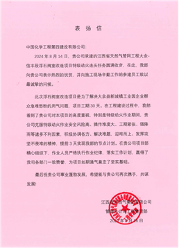 信中表示,在工程建設(shè)過程中,公司對項目建設(shè)高度重視,特別是特級動火作業(yè)期間,公司克服特級動火作業(yè)安全風(fēng)險高、操作難度大、工期緊張、強降雨等諸多不利因素,積極協(xié)調(diào)各方、迎難而上,提前3天實現(xiàn)節(jié)點計劃。在項目部精心組織下,作業(yè)人員嚴(yán)格執(zhí)行作業(yè)紀(jì)律,落實工作計劃,為項目如期通氣奠定了堅實基礎(chǔ),贏得了江西省天然氣集團各部門一致贊譽。