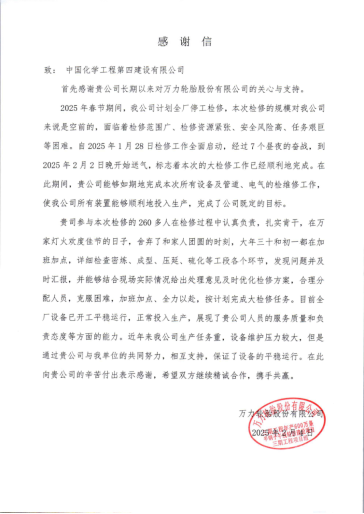 近日,華南公司從化萬力輪胎三期項目團隊收到萬力輪胎股份有限公司發(fā)來的感謝信。信中高度贊揚公司項目團隊在2025年春節(jié)期間高效完成全廠停工大檢修任務,以專業(yè)能力和責任擔當助力業(yè)主實現(xiàn)“開門穩(wěn)、開門紅”。