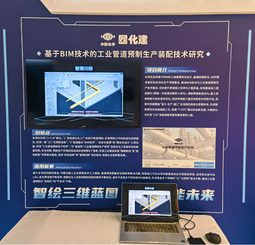 會(huì)議期間,舉行了中國(guó)化學(xué)首屆青年創(chuàng)新創(chuàng)效展,公司青年創(chuàng)新創(chuàng)效項(xiàng)目——基于BIM技術(shù)的工業(yè)管道預(yù)制生產(chǎn)裝配技術(shù)研究項(xiàng)目亮相展會(huì),通過視頻、圖文及展板講解等多種形式,全方位展示了項(xiàng)目成果。該項(xiàng)目通過“1+3+N”模式推動(dòng)施工數(shù)字化轉(zhuǎn)型,預(yù)制率提升至60%,為傳統(tǒng)施工模式注入數(shù)智化動(dòng)力。