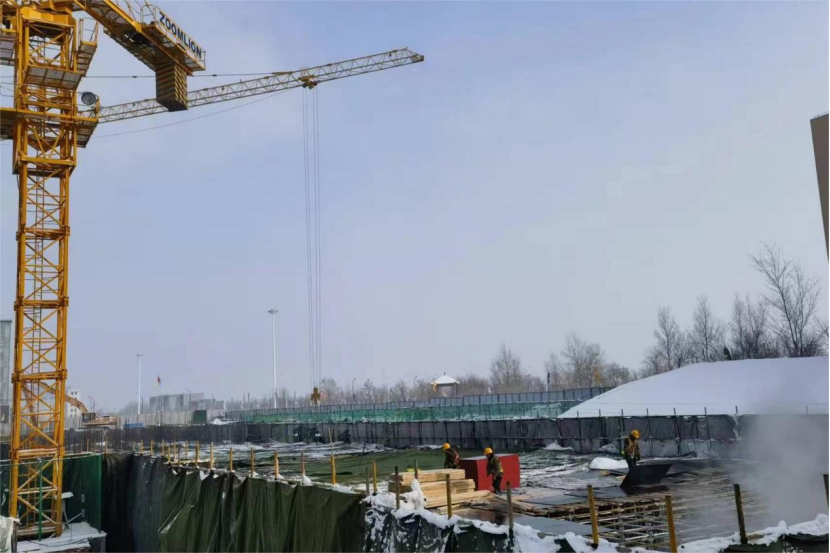 該項目所處新疆烏魯木齊,冬季施工時溫度已達零下,且隨時面臨氣溫驟降的可能,工期十分緊張。為安全、高效、高質(zhì)量完成目標,項目部提前策劃,精心部署,發(fā)揮黨員示范帶頭作用,經(jīng)過60余小時的攻堅奮戰(zhàn),分兩次完成了此次筏板澆筑工作。同時,為防止冬季施工凍融現(xiàn)象對周邊既有結構及基坑內(nèi)部造成不良影響,項目部在筏板四周及中間部位搭設暖棚及蒸汽暖氣包,澆筑時嚴格控制砼入模及成型溫度,及時覆蓋薄膜,并在砼初凝后覆蓋棉被確?;炷临|(zhì)量。